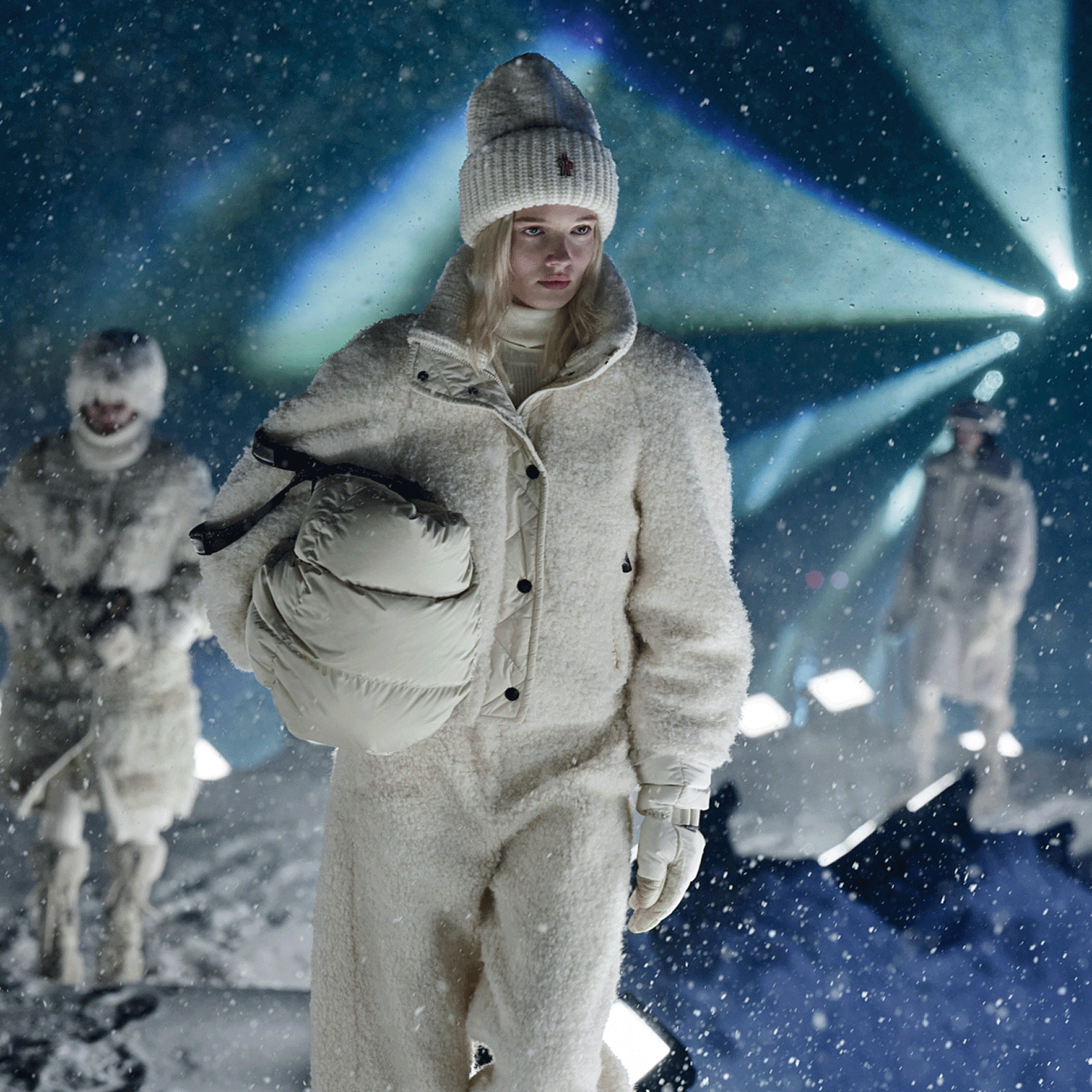 Cumartesi gecesi, Moncler'in Fall 2025 koleksiyonu, unutulmaz bir etkinliğe ev sahipliği yaptı. 350 katılımcı, tepede kurulan stadyum oturma düzeninden defileyi izlerken, altlarında ısınan minderler ve dizlerinde bej renkli battaniyeler vardı. Etkinlikte, herkes, Moncler'in zorunlu kıldığı hacimli, kapüşonlu beyaz montları giyerek soğuk havaya karşı korundu.