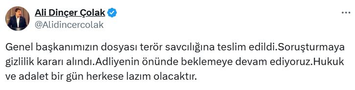 “Genel başkanımızın dosyası terör savcılığına teslim edildi. Soruşturmaya gizlilik kararı alındı. Adliyenin önünde beklemeye devam ediyoruz. Hukuk ve adalet bir gün herkese lazım olacaktır.”