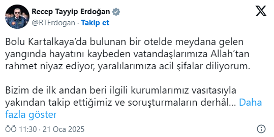 "Bolu Kartalkaya’da bulunan bir otelde meydana gelen yangında hayatını kaybeden vatandaşlarımıza Allah’tan rahmet niyaz ediyor, yaralılarımıza acil şifalar diliyorum.